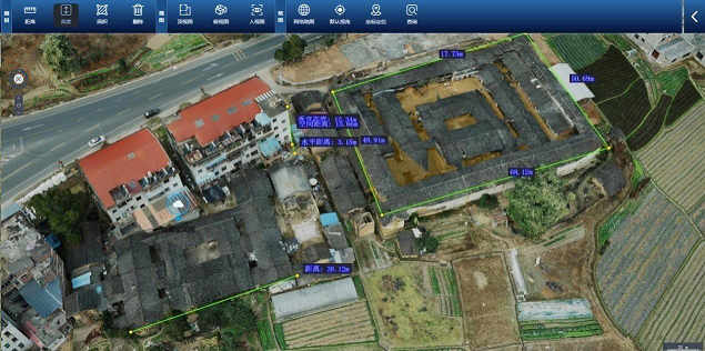 實(shí)景測(cè)量數(shù)據(jù)構(gòu)建的平臺(tái)三維實(shí)景模型能夠準(zhǔn)確地表現(xiàn)出各單體建筑之間的間距和相對(duì)位置信息,使其總體布局和環(huán)境一目了然。利用展示平臺(tái)測(cè)量工具實(shí)現(xiàn)區(qū)域文物建筑的距離量測(cè)、高度量測(cè)、面積量測(cè)等功能。