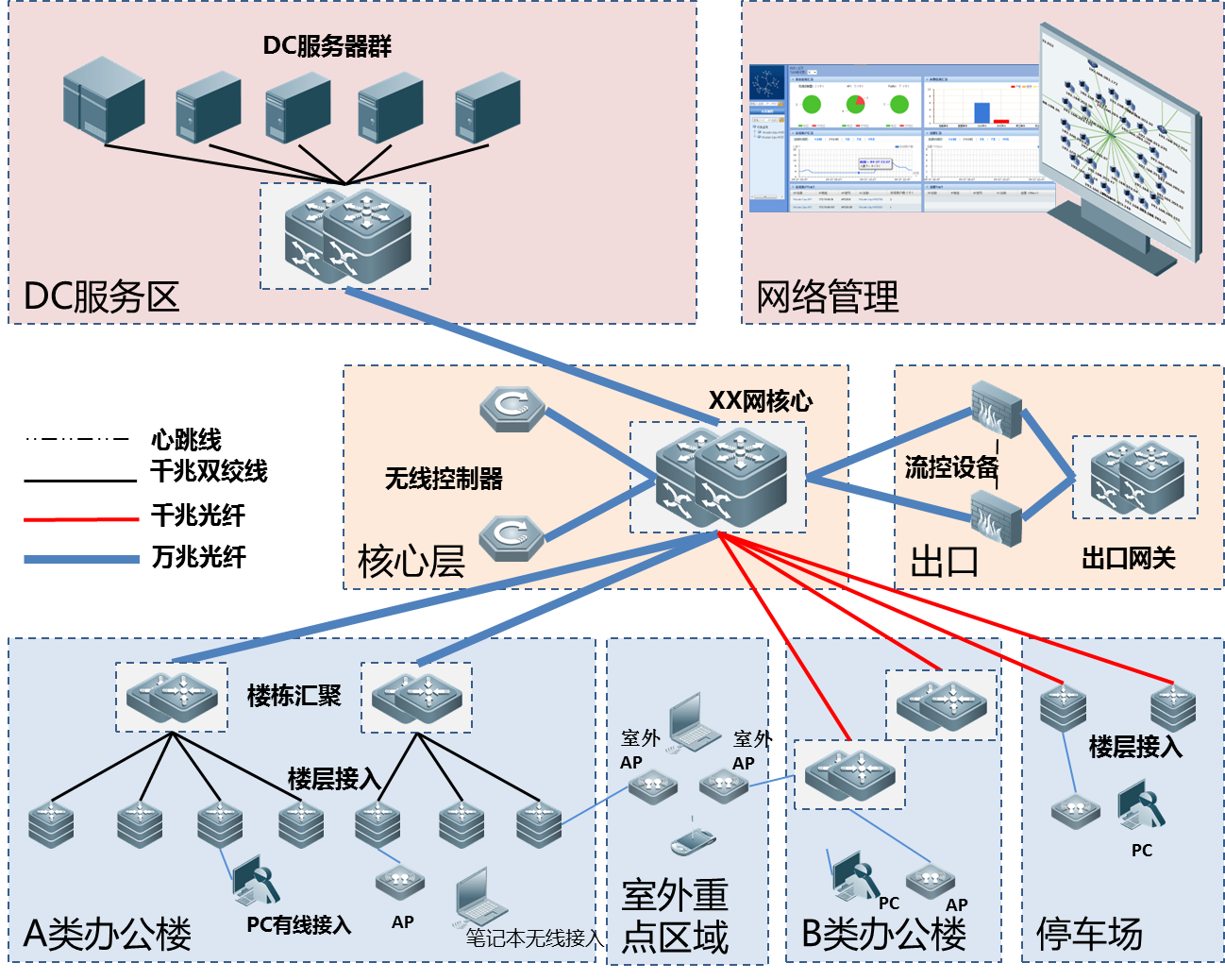 基礎(chǔ)網(wǎng)絡(luò)平臺作為無線網(wǎng)絡(luò)覆蓋的基礎(chǔ),其數(shù)據(jù)傳輸能力和穩(wěn)定性將直接影響到無線網(wǎng)絡(luò)的接入,基礎(chǔ)網(wǎng)絡(luò)平臺的設(shè)計將從網(wǎng)路本身的健壯性方面出發(fā),將底層結(jié)構(gòu)夯實。再網(wǎng)絡(luò)平臺的基礎(chǔ)上增加無線管理設(shè)備和無線接入設(shè)備,實現(xiàn)無線寬帶網(wǎng)絡(luò)的覆蓋。
