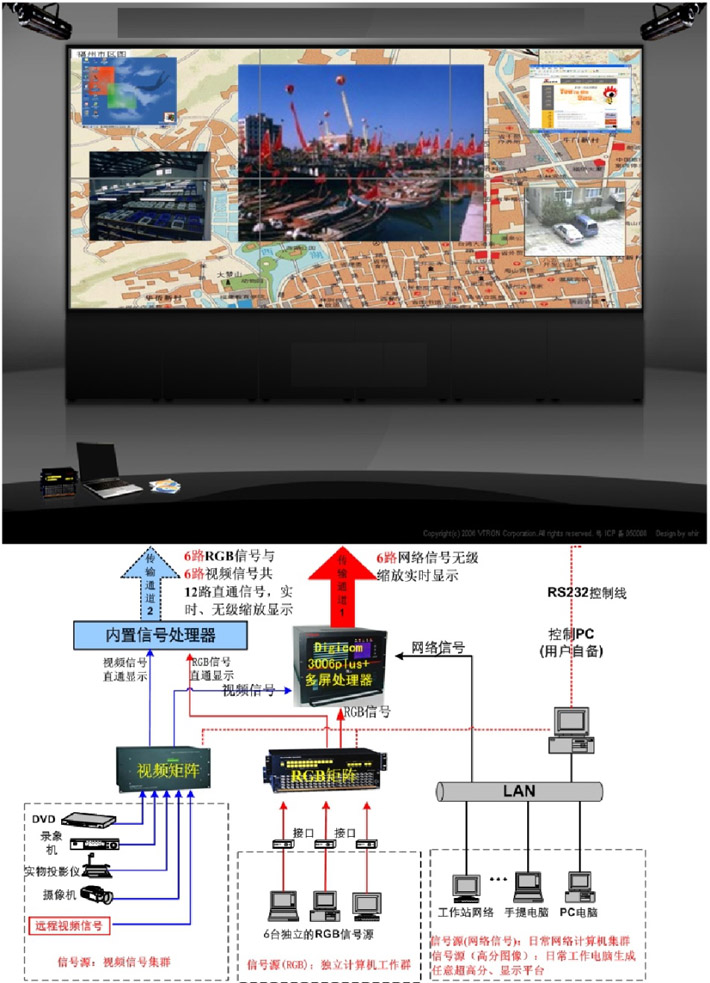 大屏幕顯示系統(tǒng)一般由以下幾部分組成:(1)顯示單元拼接墻體;(2)多屏處理器系統(tǒng);(3)顯示墻應(yīng)用管理系統(tǒng)軟件;(4)RGB矩陣切換器;(5)視頻矩陣切換器。