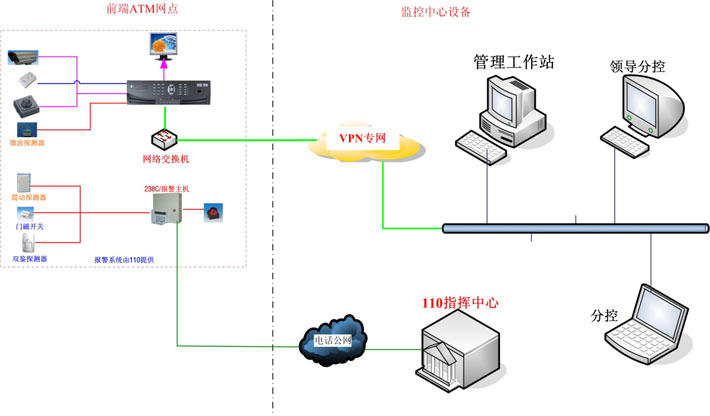 然后將自助銀行(ATM)通過網(wǎng)絡(luò)連接到監(jiān)控中心,使監(jiān)控中心值守人員能夠?qū)崟r掌握前端信息,有效保證自助銀行(ATM)的安全運(yùn)行。
