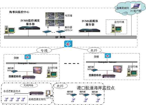 遠程網絡圖像監(jiān)控系統(tǒng)主要由監(jiān)控前端、傳輸網絡及控制中心三部分組成。監(jiān)控前端:設在各港區(qū)、碼頭等場所安裝的攝像設備和網絡視頻編碼器組成。傳輸網絡:傳輸網絡由局域網及INTERNET網組成??刂浦行模嚎刂浦行挠晒芾矸掌?、工作站和專業(yè)監(jiān)控管理軟件等組成。
