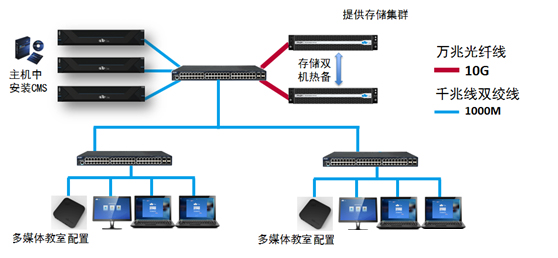 2、云終端的接入采用現(xiàn)有校園網(wǎng)的核心、匯聚、接入、安全等設(shè)備,無(wú)需單獨(dú)部署教學(xué)骨干網(wǎng),僅在數(shù)據(jù)中心按需增加數(shù)據(jù)中心核心和接入交換機(jī)即可。3、每教室部署一臺(tái)云終端或者一臺(tái)云一體機(jī)(集成鼠標(biāo)、鍵盤、顯示器),或者利舊原有PC(只需在PC上安裝云虛擬化客戶端)。三種部署方式靈活組合,根據(jù)學(xué)校需求,靈活應(yīng)對(duì)。