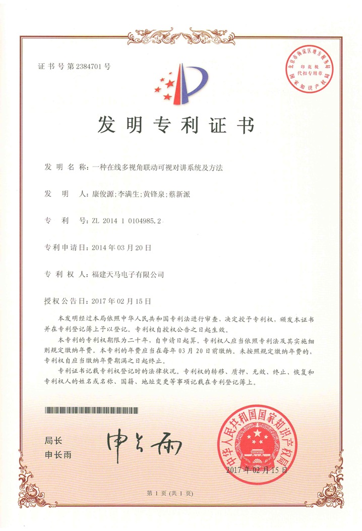公司2014年3月申請的發(fā)明專利“一種在線多視角聯(lián)動可視對講系統(tǒng)及方法”于2017年2月獲得授權(quán)。